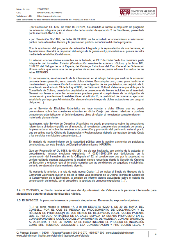 “El refugio de la c/ Espada nº22 no estuvo catalogado con ningún tipo de protección hasta 20.02.2015 cuando se incluye en el catálogo estructural del PGOU con la categoría de BRL; en aquél momento el rótulo ya no existía” o que “La consideración legal de BRL le viene dado por Ley 9/2017, de modificación de la ley 4/1998, de Patrimonio Cultural Valenciano”.